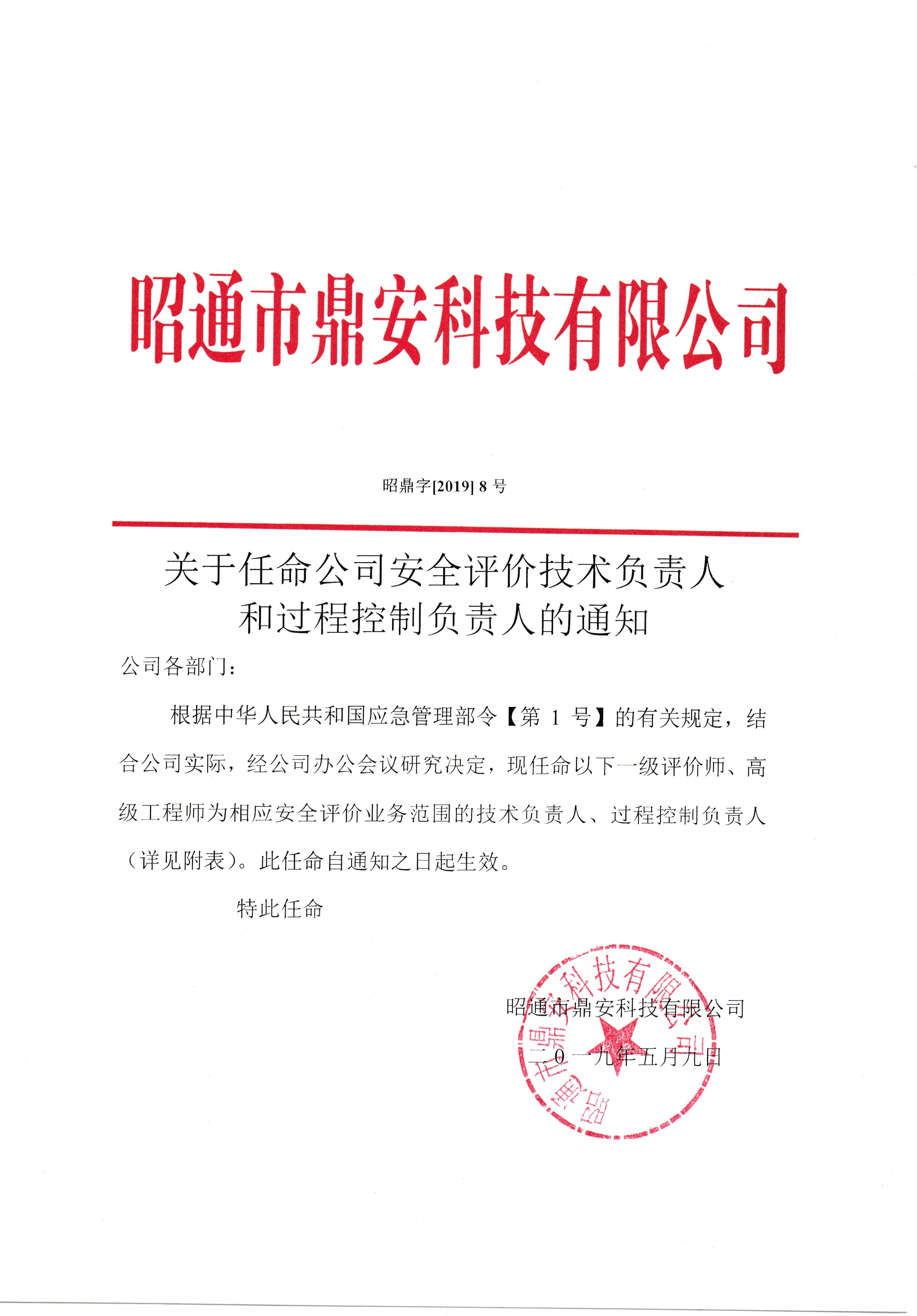 關于任命公司安全評價技術負責人和過程控制負責人的通知